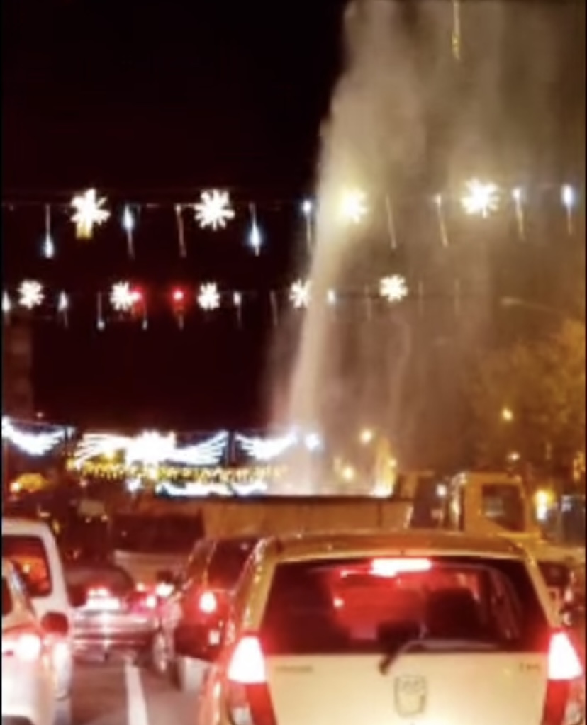 O conductă de apă s-a fisurat, iar apa a țâșnit la câțiva metri de șosea, printre beculețele festive și mașini.