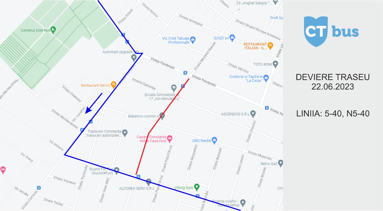 CT BUS anunță publicul călător că autobuzele liniei 5-40 și N 5-40 circulă deviat mâine, pe sensul către Campus Ovidius, pe traseul: strada Democrației – strada Comarnic – strada Hatman Arbore.