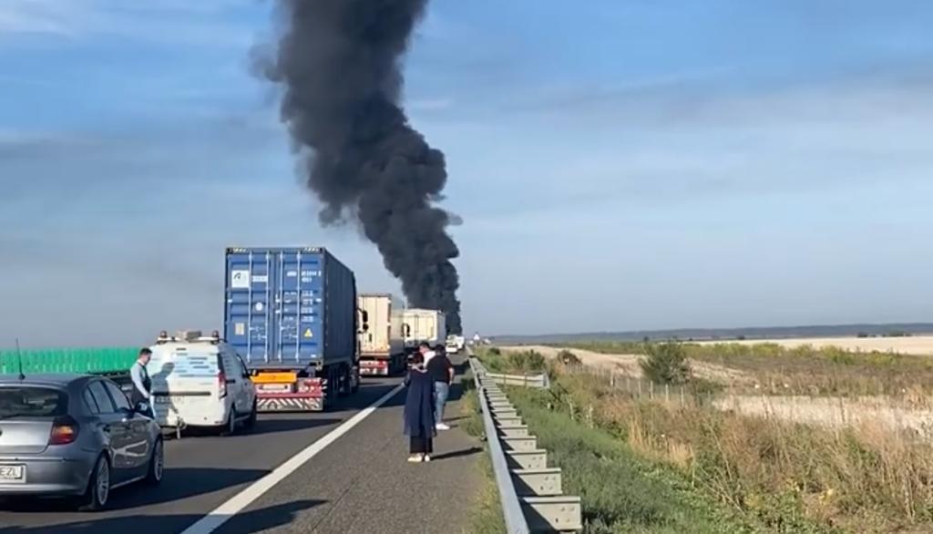 Potrivit surselor de la fața locului, TIR-ul, care transporta granule din plastic pentru realizarea de țevi, a luat foc în mers. Din fericire, șoferul a reușit să tragă pe dreapta și să iasă din vehicul.