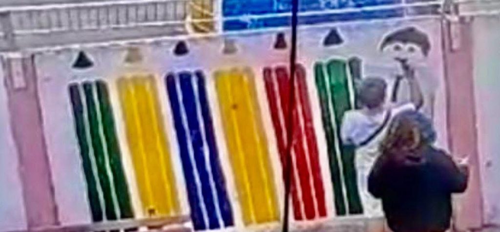 În pictura de pe zidul respectiv era desenat un elev, căruia i-au fost adăugate însă mai multe pete roșii, transformând imaginea într-una sinistră.